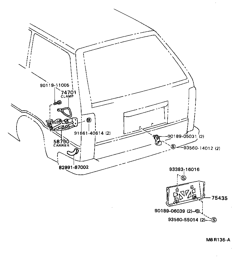 Rack. Tailgate lock striker plate & spare wheel rack lowering bolt (02/5)